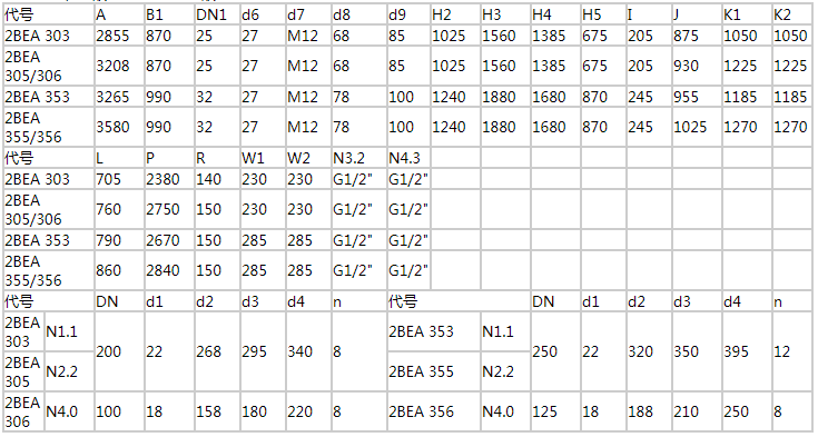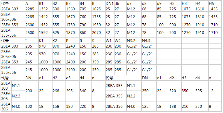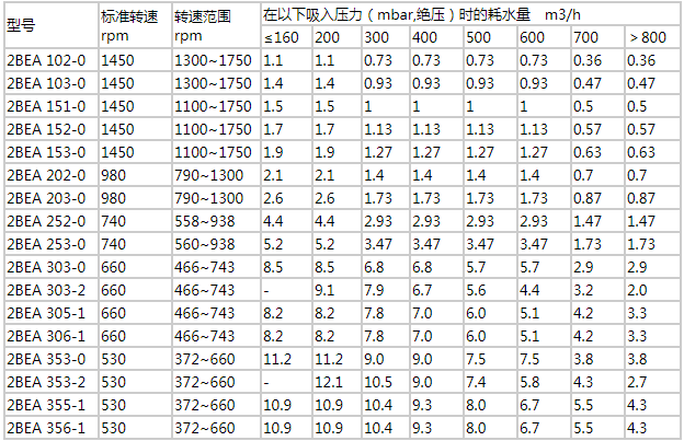 注:以上所選電機功率可在大多工況下工作。如排氣口壓力較高(0.02~0.05MPa),則應(yīng)相應(yīng)加大電機功率;如2BEA水環(huán)式真空泵正常工作時軸功率較小,也可選用接近軸功率的電機功率,如此更為節(jié)能。