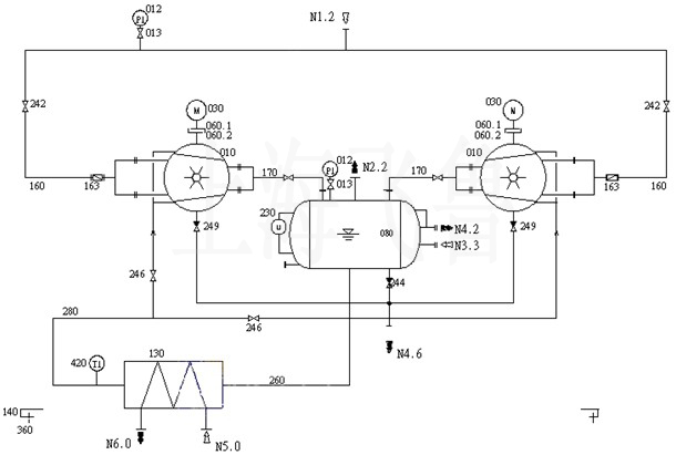 工作液用于形成真空泵的液環(huán)。工作液通過管線(260),自分離器(080)流入換熱器 (130),冷卻后通過管線(280)返回真空泵。在此過程中,壓縮產(chǎn)生的熱及隨被抽氣體 帶入的熱被釋放掉。該閉環(huán)機組設(shè)計為兩臺真空泵(010)共用一臺分離器(080)和一臺換熱器(130)(真空泵一開一備),一臺真空泵工作時,備用泵的吸氣管路和排氣管路上的蝶閥須關(guān)好。正常多采用一臺真空泵(010)配套一臺分離器(080)和一臺換熱器(130)。